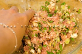 Trộn đều thịt heo xay với hành lá, nấm đông cô và gừng bào.