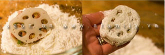 Nhúng những miếng củ sen kẹp thịt vào bột năng, rũ bỏ bột thừa.