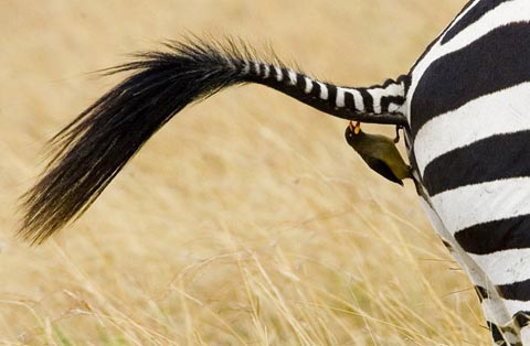 Một con chim oxpecker mỏ vàng đang giúp ngựa vằn làm vệ sinh cá nhân ở Kenya.