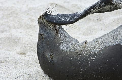 Một con sư tử biển khổng lồ ở đảo Galapagos dường như đang hôn chân chèo của chính nó - một hành động người ta thường làm khi họ cảm thấy hài lòng với bản thân.