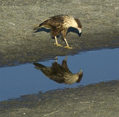 Một con chim cắt đực caracara ngắm nhìn bóng mình trong một vũng nước nhỏ ở Florida, Mỹ.
