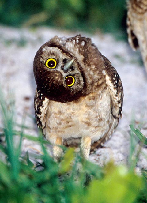 Một con cú xoáy đầu nhìn trừng trừng về phía ống kính chụp hình ở bãi biển Pompano, Florida, Mỹ.