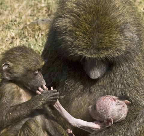 Một chú khỉ đầu chó đang âu yếm đứa em mới sinh trong vòng tay mẹ ở vùng hồ Nakuru, Kenya, châu Phi.