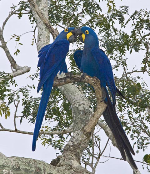 Một cặp vẹt đuôi dài Hyacinth đang tình tự ở Pantanal, Brazil.