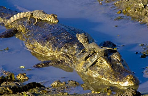 Một con cá sấu mẹ chở 2 con trên lưng vượt sông ở Pantanal, Brazil.