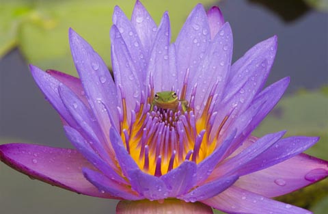 Một con ếch cây màu xanh ngồi chễm chệ trên bông hoa súng ở miền trung Florida, Mỹ